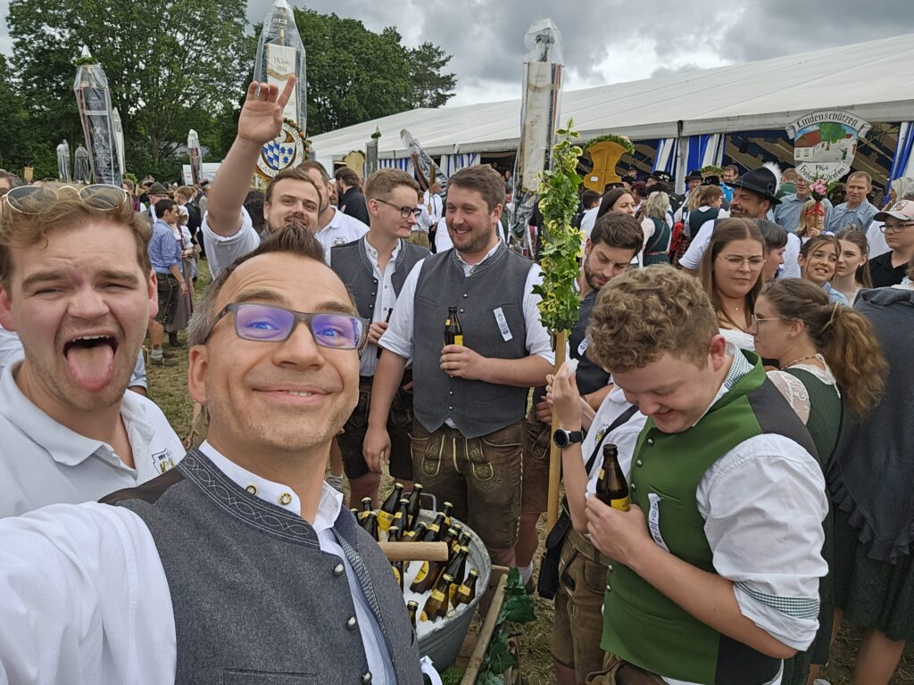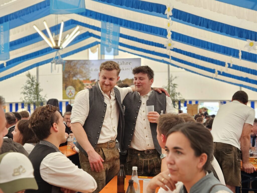 Nach dem offiziellen Teil ging es in das Festzelt, das mit typisch blau-weißen Girlanden und bunten Fahnen geschmückt war. Die Stimmung war ausgelassen, und bei bayerischen Schmankerln und frischem Bier konnte man gemütlich beisammensitzen. Es wurde viel gelacht, gesungen und die Verbundenheit zur bayerischen Tradition gefeiert.