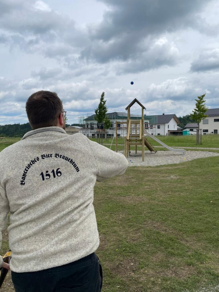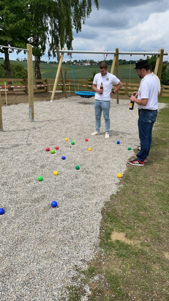 Gut gestärkt und Aufgetankt machten sich die Pilger mit dem Firmenwagen und 2 Tragl Bier in dezimierter Anzahl weiter (Die anderen hat es wo anders hin verschlagen) Richtung Berghofen wo jedoch erst mal ein Zwischenhalt am neuen Spielplatz in Haunwang eingelegt wurde um Boccia zu spielen.